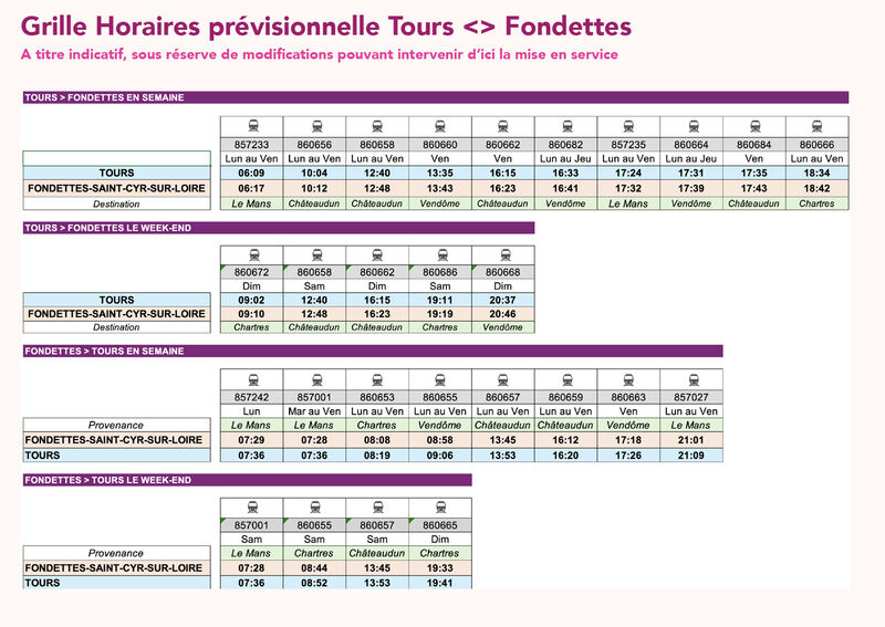 Desservie de nouveau dès le 14 décembre 2025 (grille horaire ci-dessous) par les trains RÉMI exploités par SNCF Voyageurs, la gare permettra de rallier Tours en moins de 10mn grâce à 6 à 8 trains dans chaque sens en semaine grâce notamment à l’augmentation des fréquences sur la ligne Tours <> Vendôme souhaitée par la Région Centre-Val de Loire.